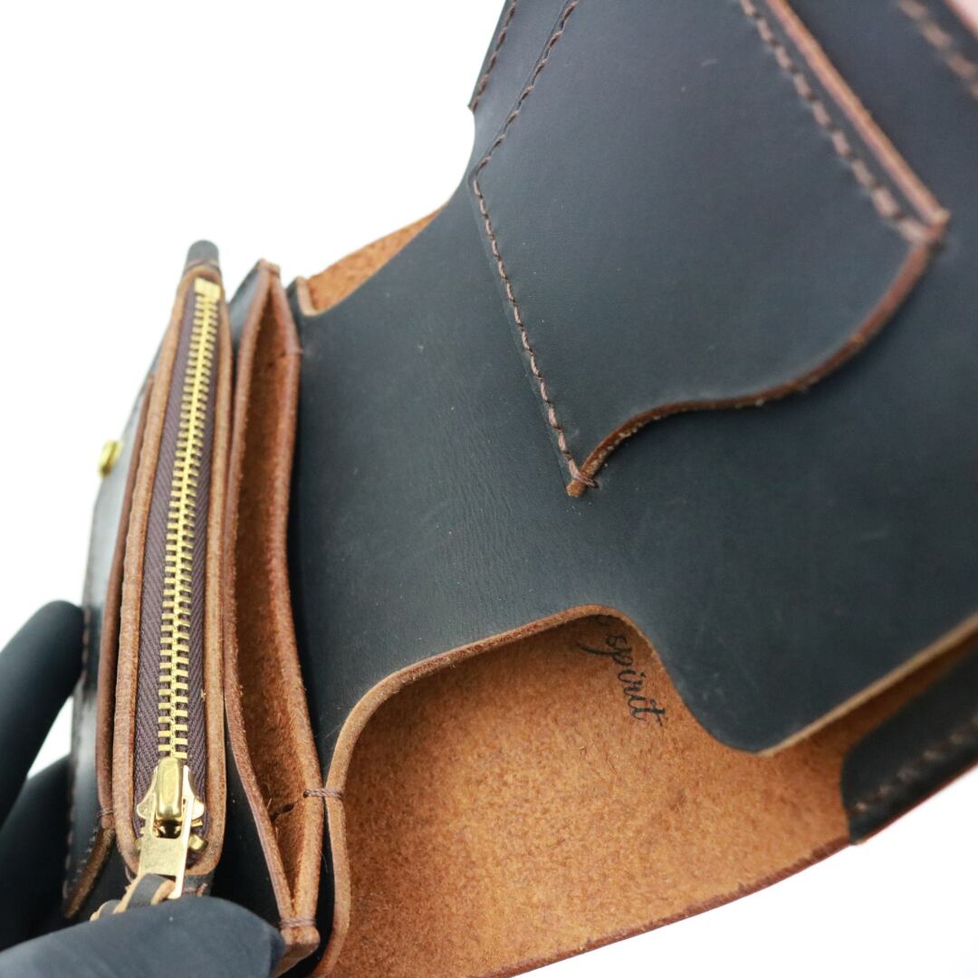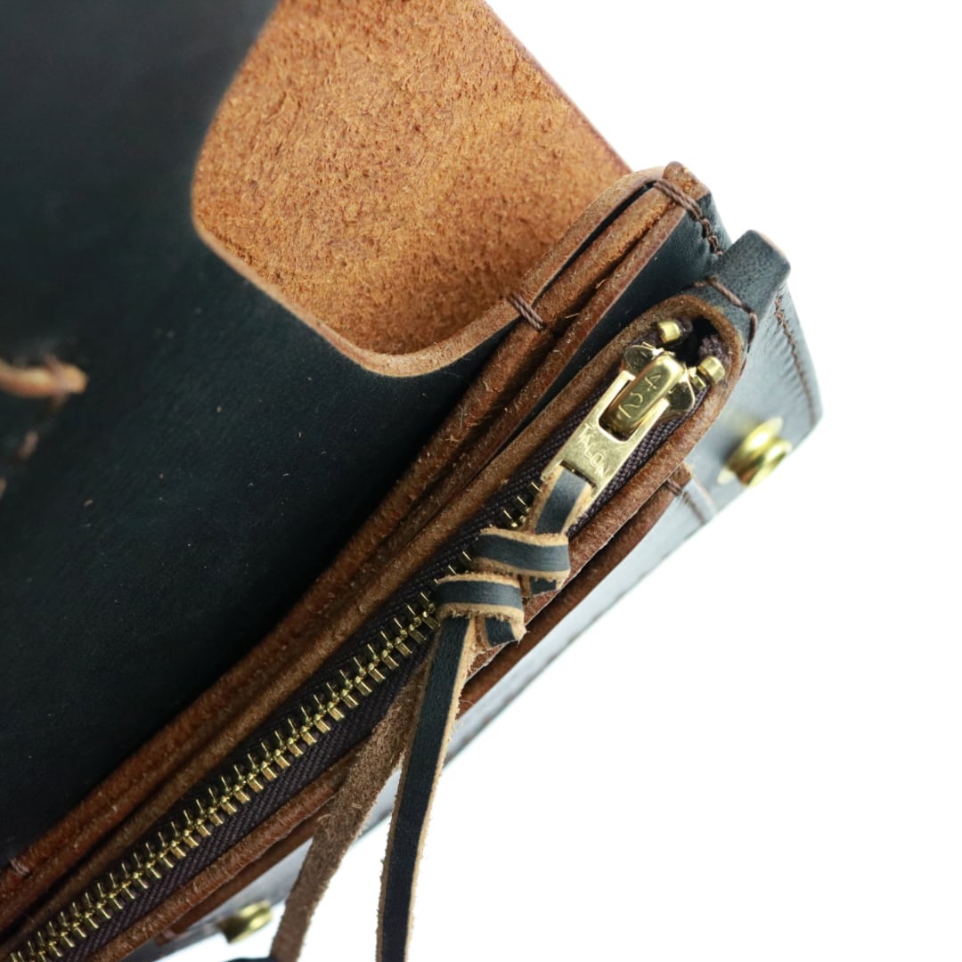 上質な茶芯ワックスレザーを使用し、ジッパーは【42Talon】を採用。金具類はすべて真鍮製で仕上げています。